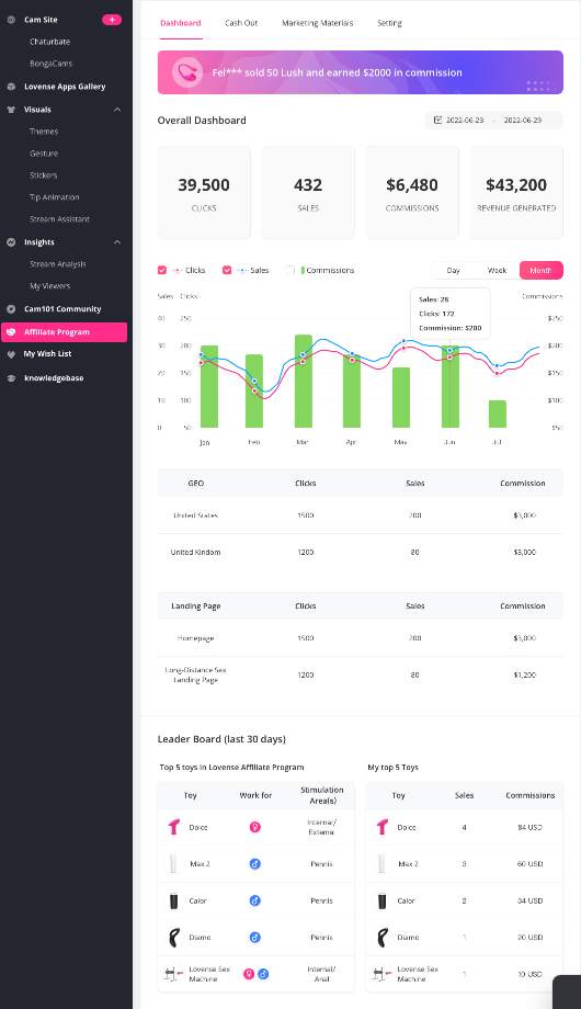 Nueva interfaz del programa de afiliación. Accede a los resultados de tus campañas de promoción con nuevos visuales que muestran los clicks, ventas, comisiones e ingresos totales generados de una manera clara y dinámica.
