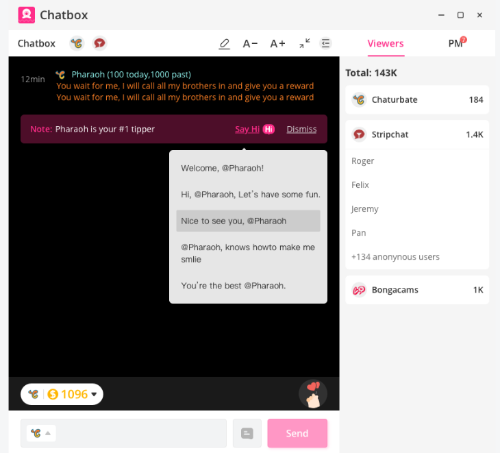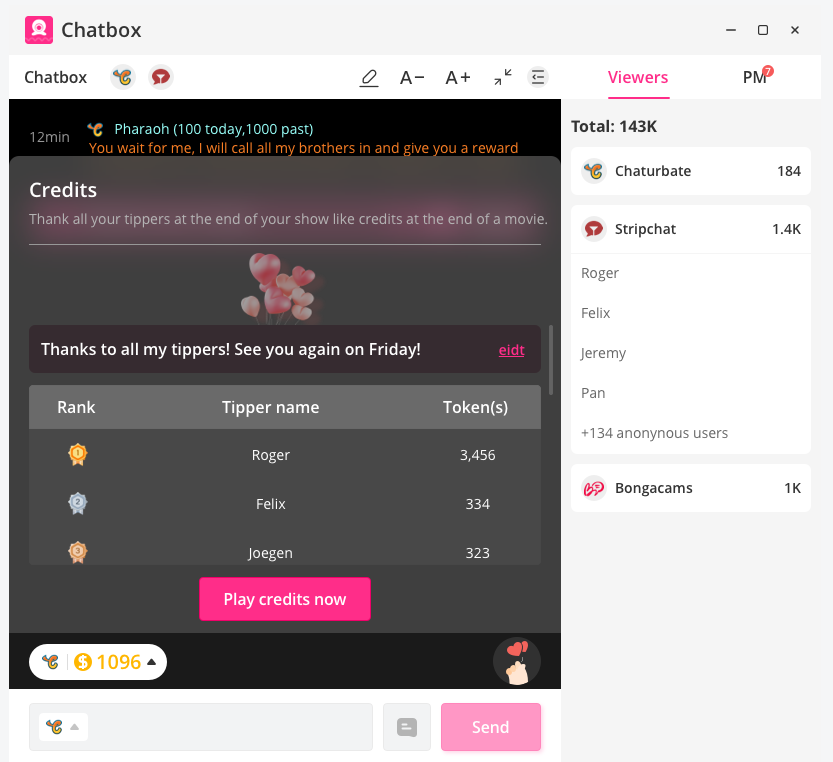 Tu ChatBox agrega una función que te alerta cuando tu tipper más importante se conecta, y te permite enviarle un mensaje rápidamente con plantillas predeterminadas, además de una función de créditos para agradecer a todos los tippers su contribución al final de cada transmisión.