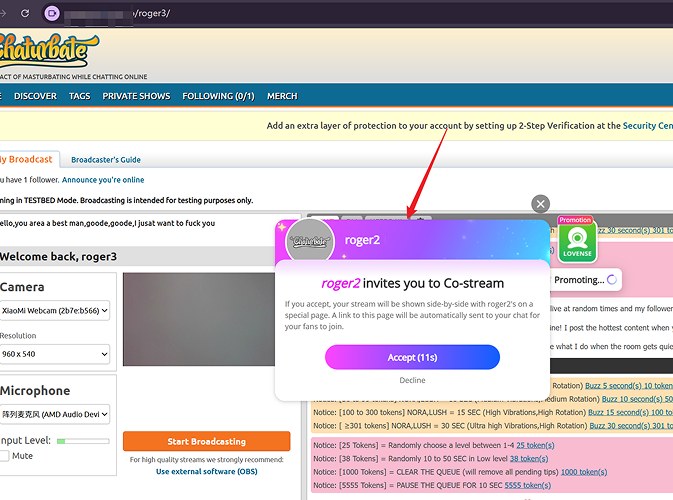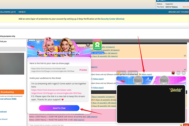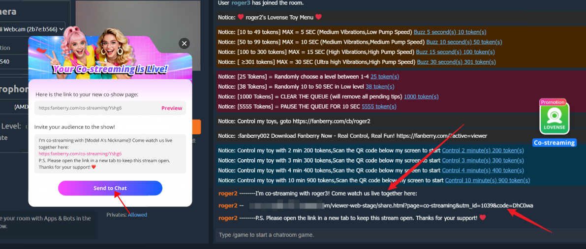 Co-Streaming is a broadcasting mode where two models go live together on the same screen, allowing you to share traffic, boost fan interaction, and increase earnings. Viewers can watch both models at the same time for a more exciting experience. You’ll also gain more followers, more interactions, more income, and more fun during your broadcast. (Currently supported only on Chaturbate.)