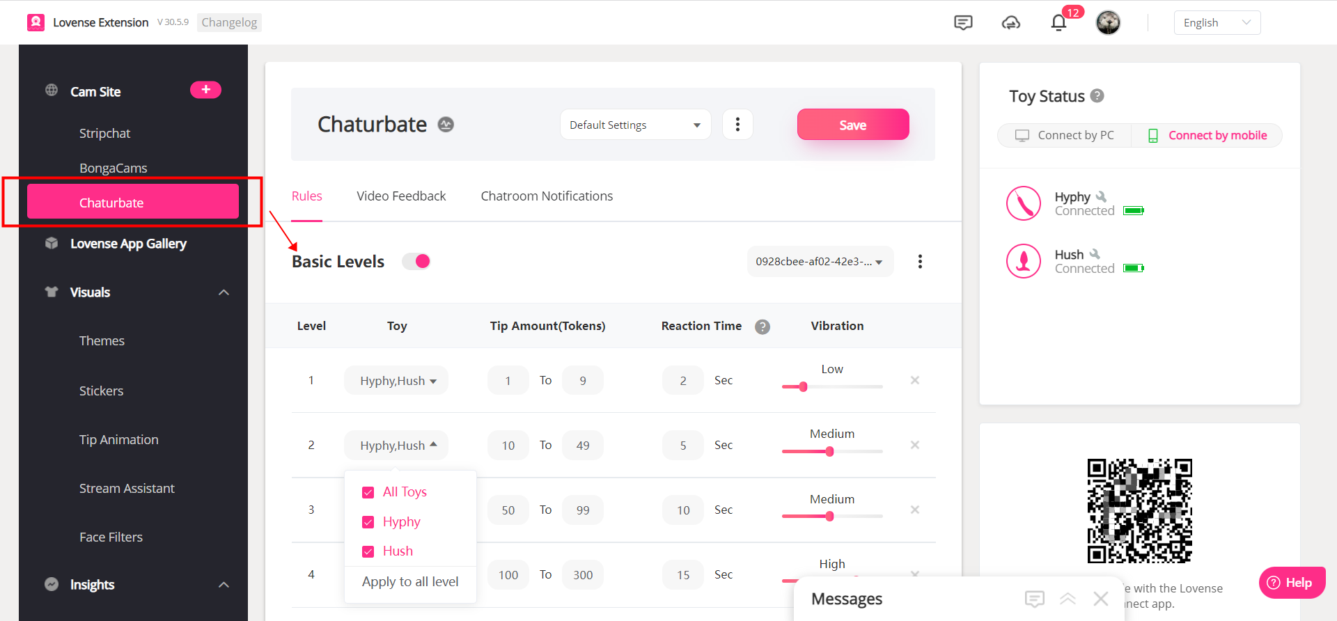You can choose from setting your own custom settings, the Lovense recommended ones, or you can import existing ones. You can also set your Special Commands, but this is optional. It's best to use different tip amounts for the Special Commands and the Basic levels to avoid a conflict for a certain amount. If there is an overlapping tip amount between Special Commands and your Basic Levels, the toy will only react to the Special Commands for that tip amount.