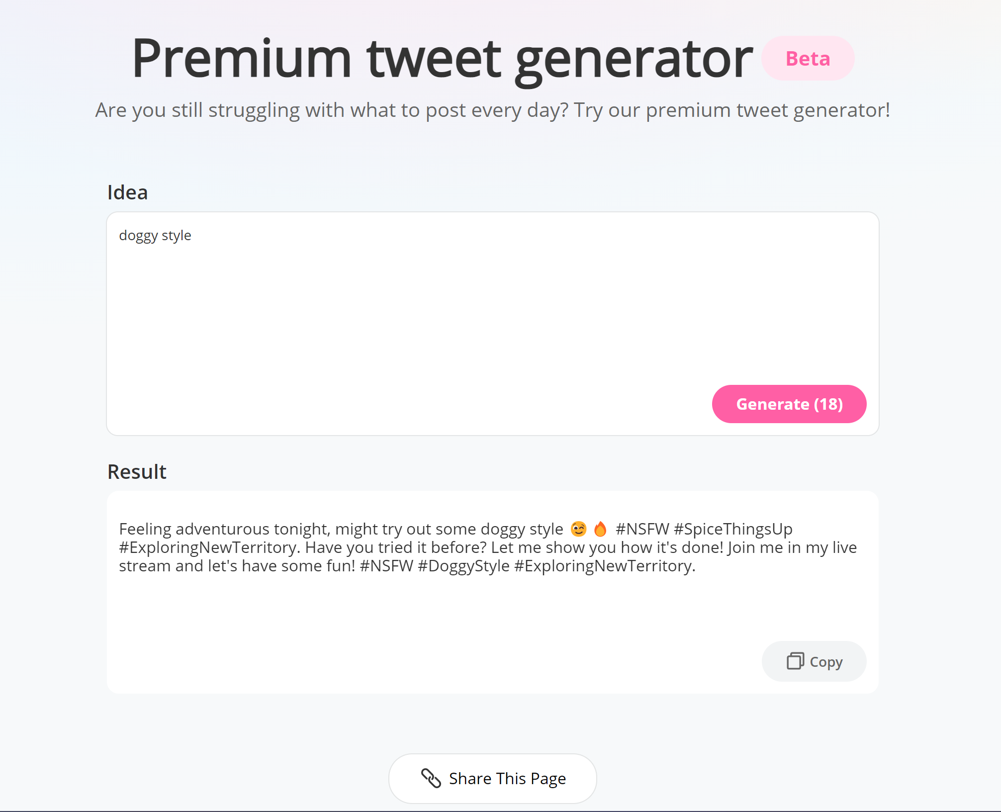 However, it is important to note that many ChatGPT models do not allow NSFW content, so you may get rejected. In this case, you can use another tool: the Premium Tweet Generator (Beta) by Lovense, which allows you to bypass NSFW restrictions and generate tweets in seconds, complete with appropriate tags. You can use these captions on any social media platform, greatly reducing your workload.