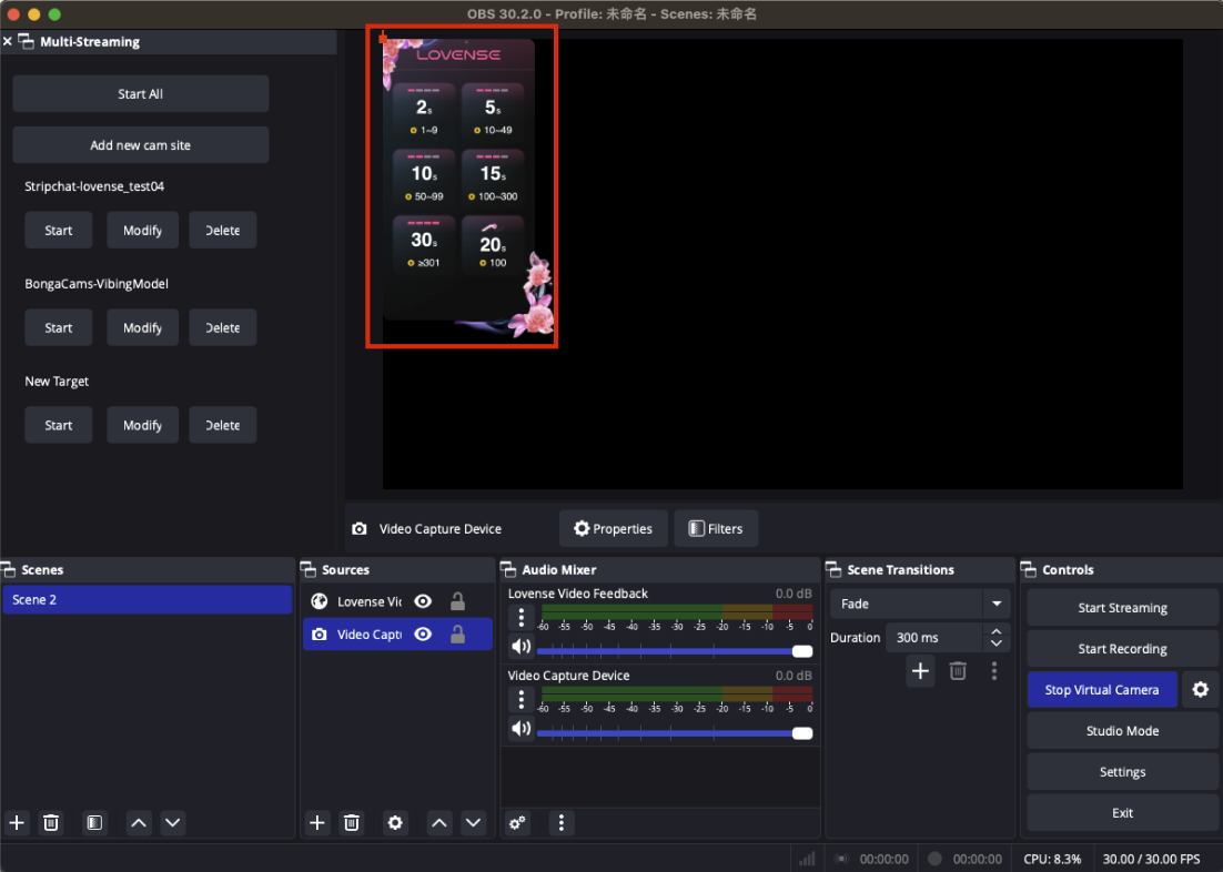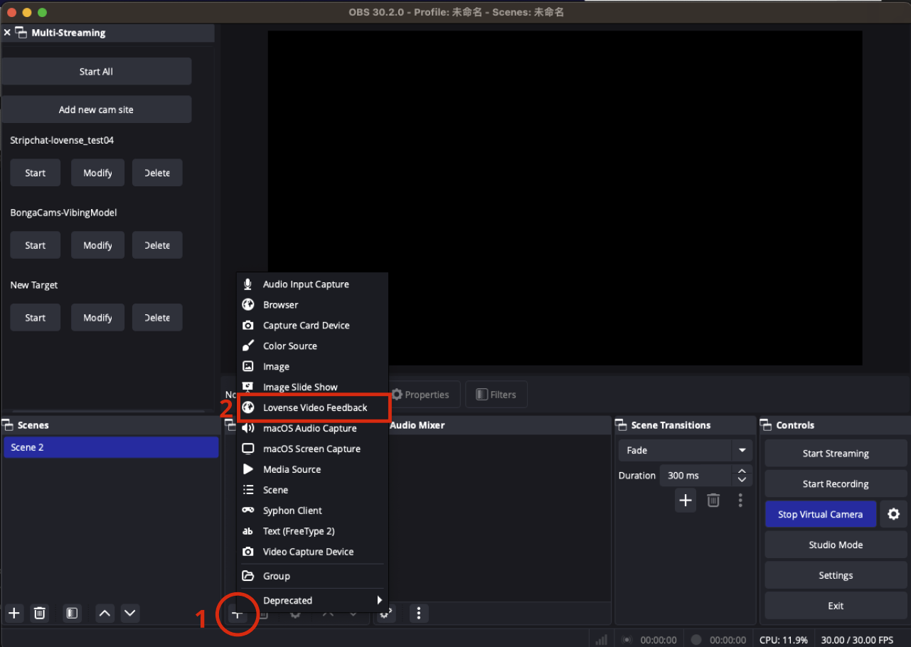 2. Open OBS and check if Lovense Video Feedback has been added to Sources. If not, click the "+" button to add Lovense Video Feedback