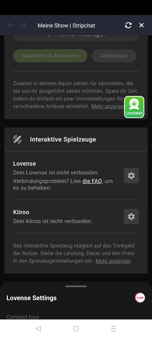 Hallo ich kann auf Stripchat meinen Lush 3 nicht verbinden. Ich habe ihn eingerichtet/ auch auf Streammaster ließ er sich einrichten. Habe probehalber am Pc alles verbunden und es funktioniert. Nur wenn ich am Handy live gehen möchte lässt er sich nicht verbinden mit Stripchat. Obwohl er ja laut Lovense & Streammaster verbunden ist. Ich weiß leider nicht was ich tun soll.