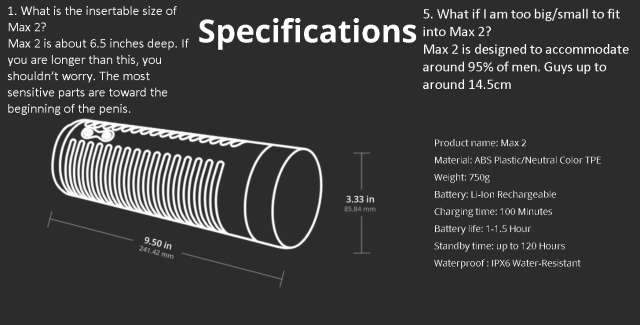 and Lovense is no help at all with the way they describe the dimensions from the front page of where you buy the max 2, it shows a diagram image with dimensions stating 9.50 inch in length and 3.33 inch in diameter (that is not the inserting, its the outside casing).
