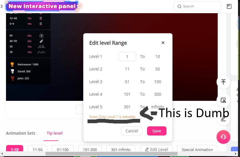 The tip animation level will automatically go alinged with the basic tip level setting, so if you want to edit these animation levels, simply go to the main basic panel and choose the desired amounts. They will show up later in the tip animation dashboard. Hope it helps, and happy camming!