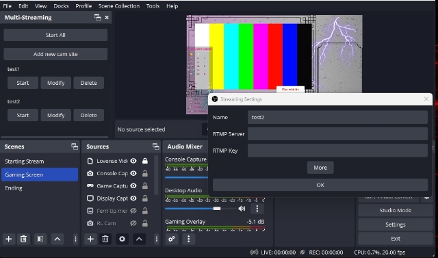 Part 1 of the question how to stream on multiple sites: From the few discussions that ask this question it seems that obs has this option? No info on how to actually go about setting it up and getting it to work properly just obs can do it. Below is a screen shot of my obs, is it as simple as putting the RTMP server and key of each cam site you are streaming to under this section? If so when I am ready to stream do I click the start streaming button, found on the lower right side of obs; or do I click the start all button, found on the upper right under multi-streaming? Do both? Something else? if so what?