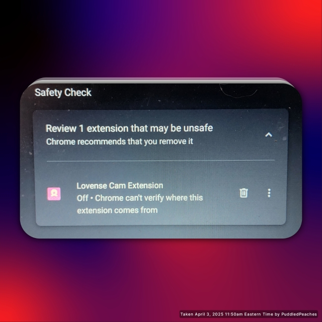 As for knowing what to trust, well that stems from knowing yourself. By knowing yourself enough, little alarms will start to go off in your mind or body. Some will call it a gut feeling or intuition. When those feelings come up, its suggested to listen to them, be aware and if possible take precautious measures. My alarm rang when being warned by Google to uninstall due to being unsafe. In case you did not see that notification I received posted in my original article, I've went ahead and documented the warning still being made today. 4 months later and still no explanation by Lovense, except for the added comment that they have placed on the extension.