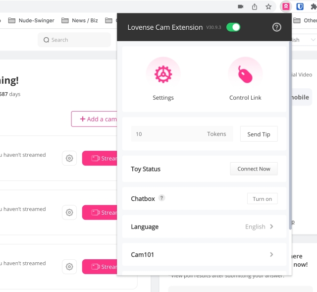 I'd suggest downloading Lovense StreamMaster. You need to have Bluetooth enabled on your computer (works fine with Mac, might need the Lovense adapter for Windows). Or you can use the Lovense app on your phone (iOS or Android). If you click on the Lovense extension you'll see the first image. Click on Settings icon and you'll then get the second image. Select Connect by PC or Mobile and then Add Toy. If you use mobile, you'll want to be use to use the Lovense app to connect to the toy first as a test.