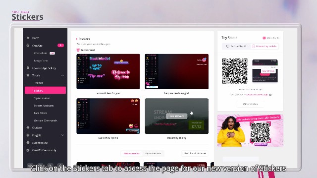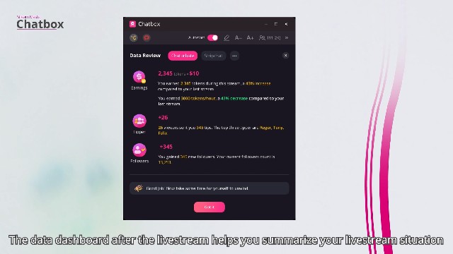 Chatbox is a powerful tool that organizes your chatroom and helps you analyze your most important data. View multiple chatrooms in one window, send automatic responses, categorize your tippers, and analyze your overall livestream performance.